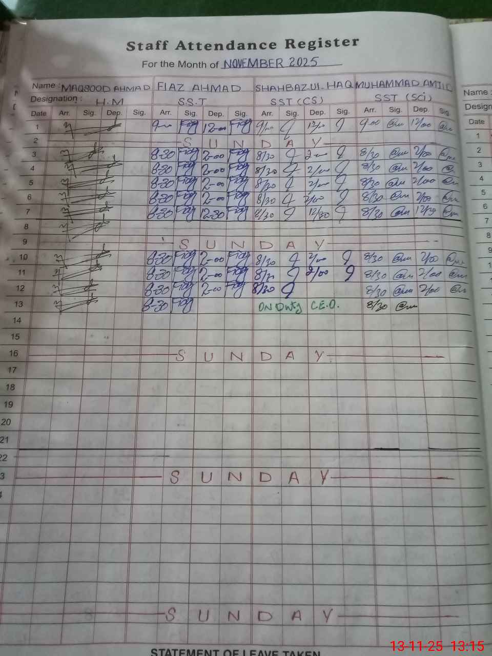 | CNIC | Full Name | Designation | R/C | Absence During Last Calender Month |