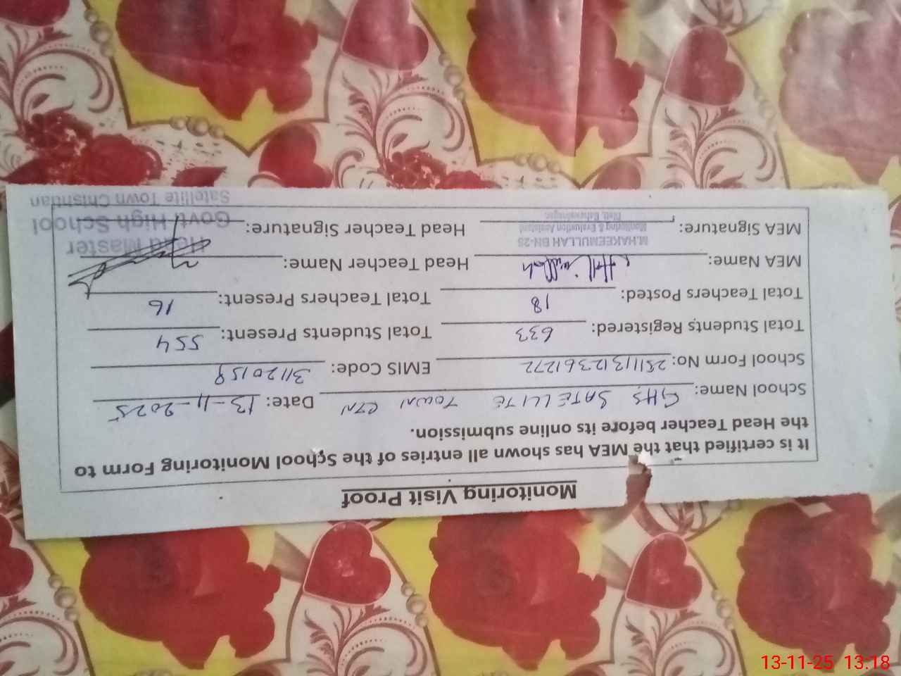 | Name: MA**** AH**** Designation: (School Headmaster's/Headmistress's) H M Phone/Cell Number: 03**** |