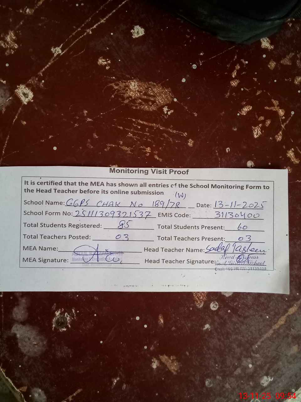 | EMIS Code: 31130400 | Name of School: GGPS CHAK NO 189/7-R W | |||
