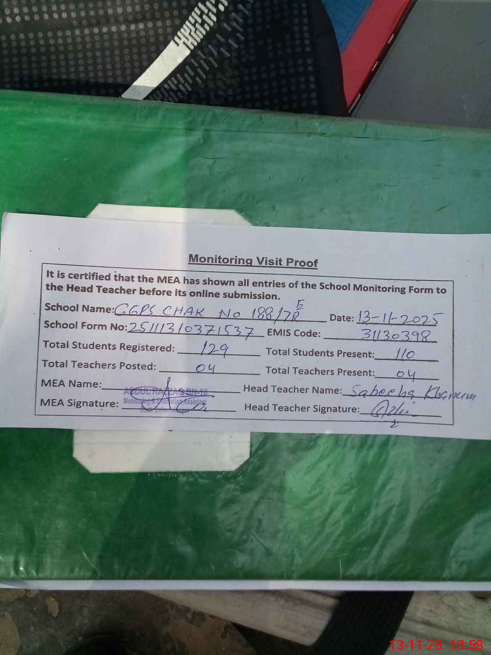 | EMIS Code: 31130398 | Name of School: GGPS CHAK NO 188/7-R E | |||