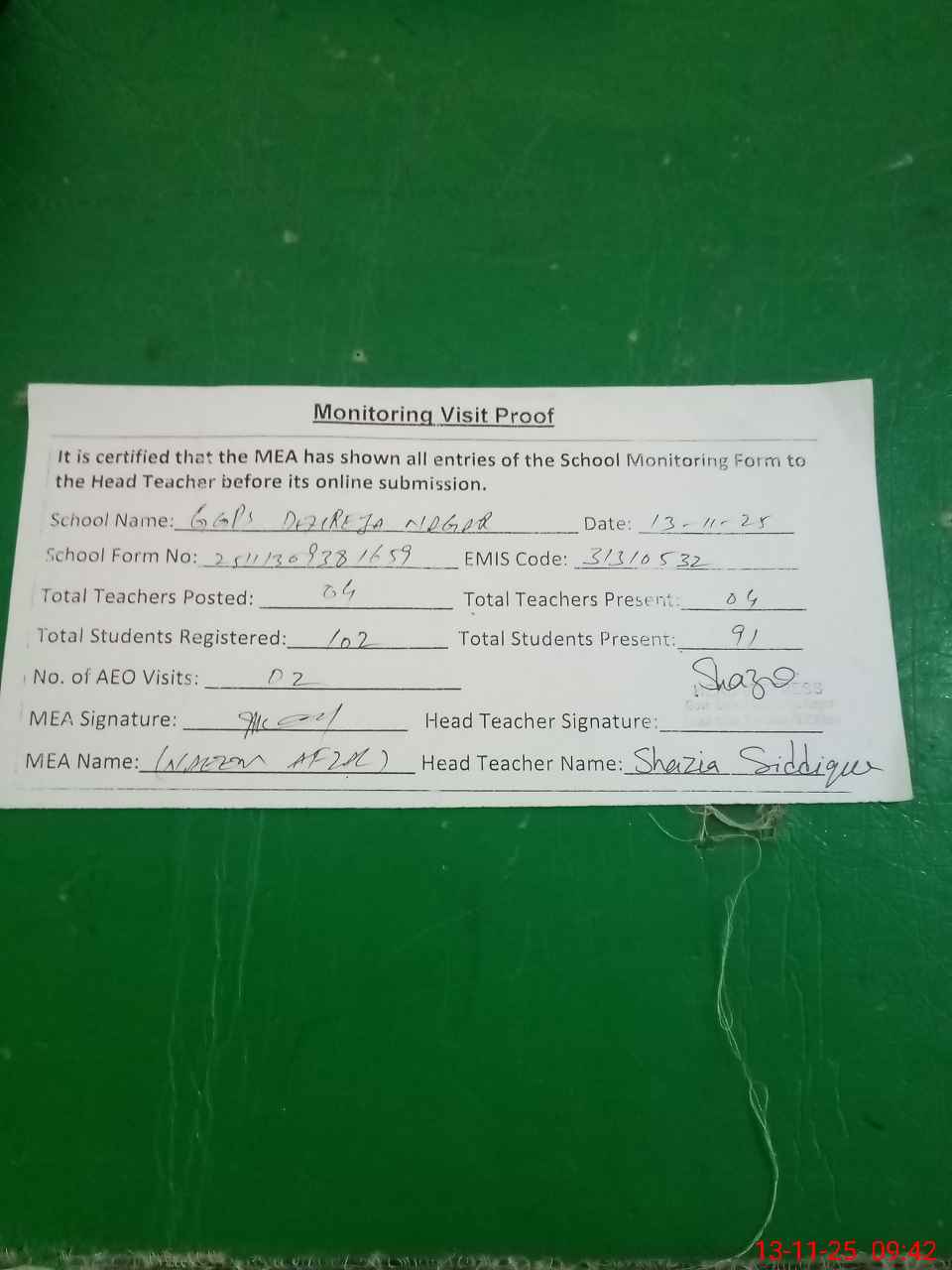 | Attendance Register | Head Teacher | MEA with School | Visit Proof |