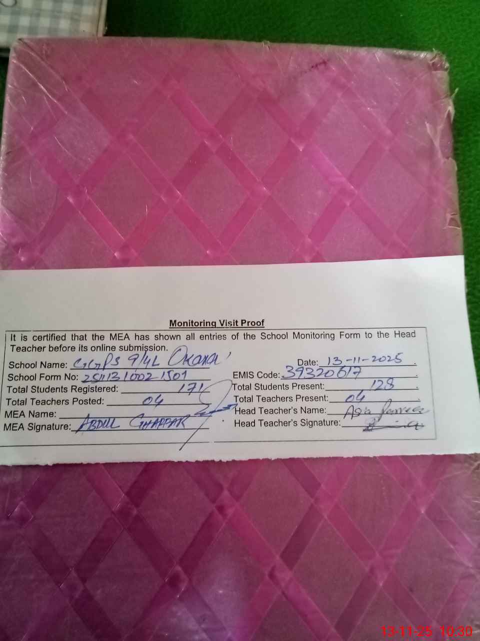 | Attendance Register | Head Teacher | MEA with School | Visit Proof |