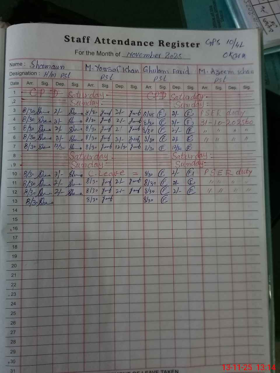 | CNIC | Full Name | Designation | R/C | Absence During Last Calender Month |