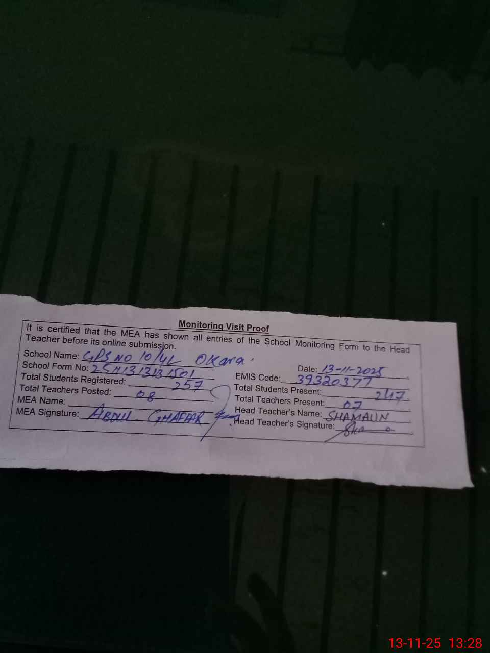 | Attendance Register | Head Teacher | MEA with School | Visit Proof |