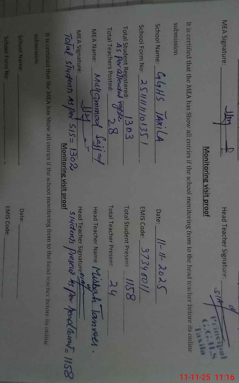 | EMIS Code: 37340011 | Name of School: GGHS TAXILA | |||