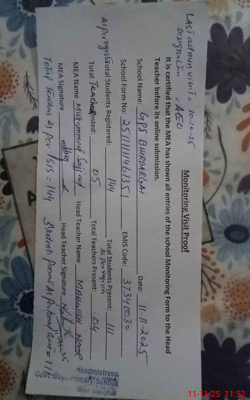 | EMIS Code: 37340030 | Name of School: GPS BHIRDAR GAHI | |||