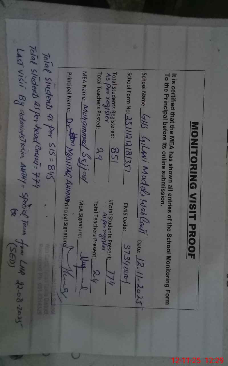 | EMIS Code: 37340001 | Name of School: GHS GELLANI MODEL WAH CANTT | |||