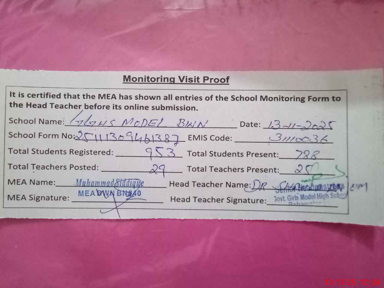 | EMIS Code: 31110036 | Name of School: GGHS MODEL BAHAWALNAGAR | |||