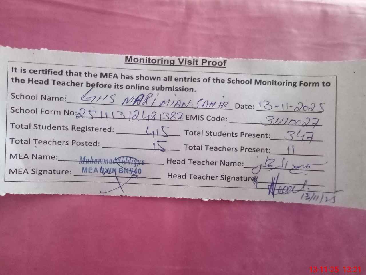 | Attendance Register | Head Teacher | MEA with School | Visit Proof |