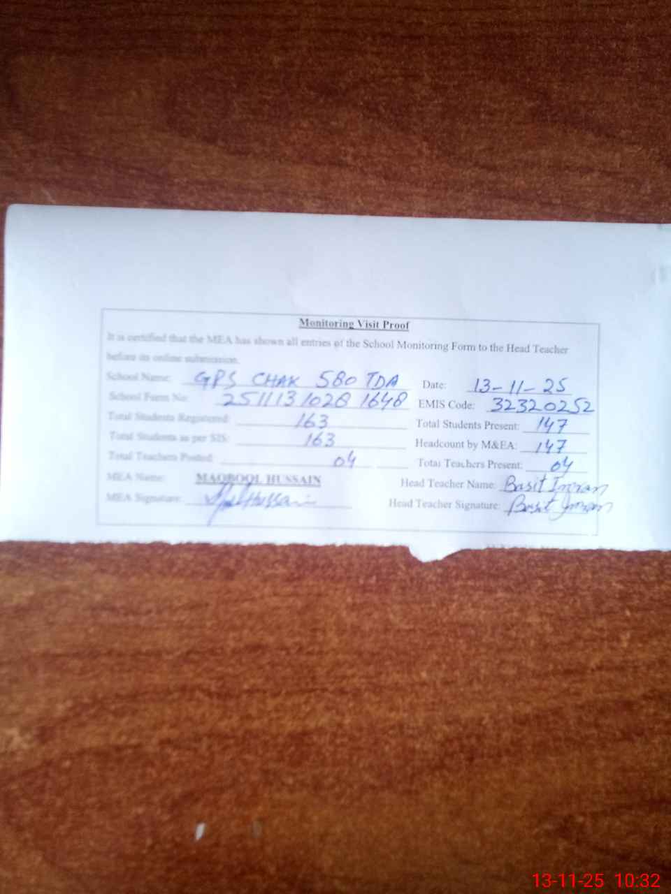 | EMIS Code: 32320252 | Name of School: GPS CHAK NO.580 TDA | |||