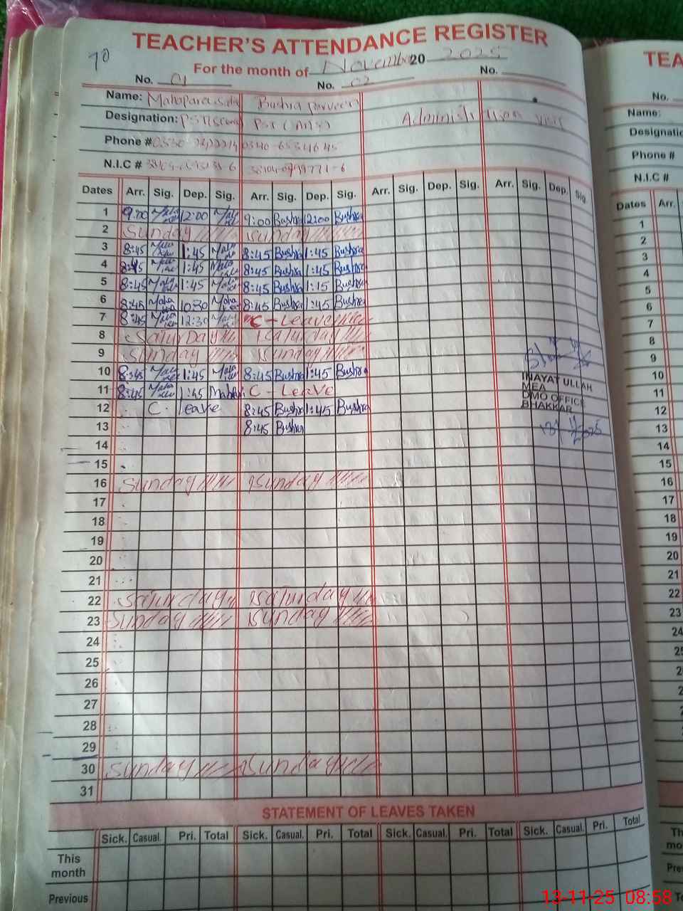 | CNIC | Full Name | Designation | R/C | Absence During Last Calender Month |