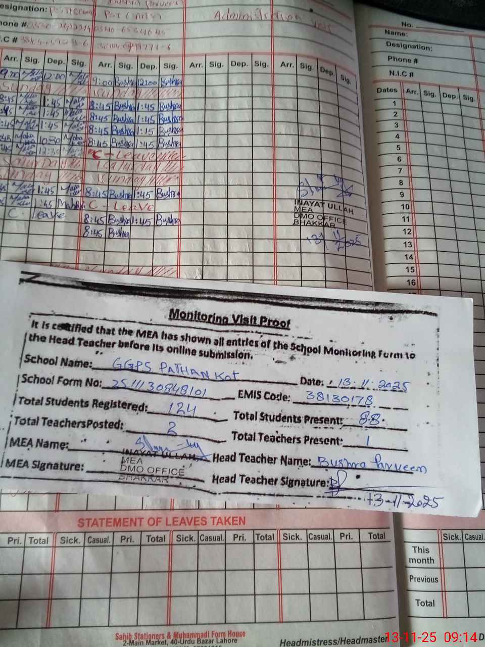 | Attendance Register | Head Teacher | MEA with School | Visit Proof |