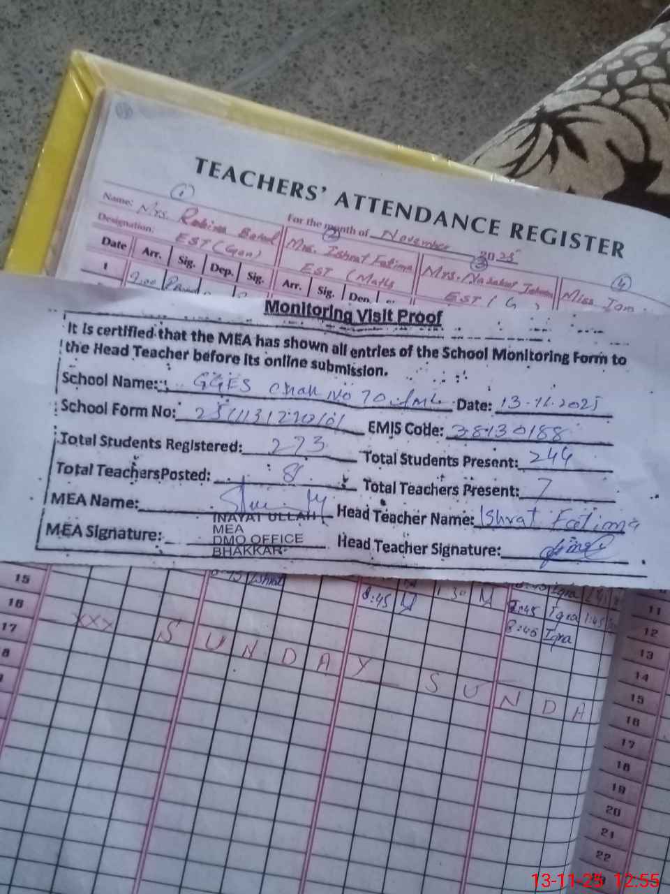 | Attendance Register | Head Teacher | MEA with School | Visit Proof |