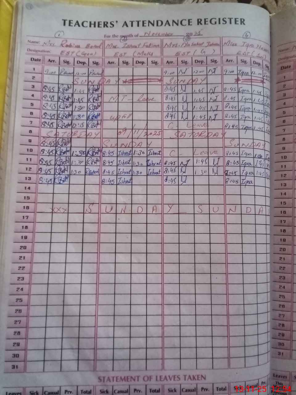| Leave | Duty | Absent | Maternity | Medical | Ex- Pak |