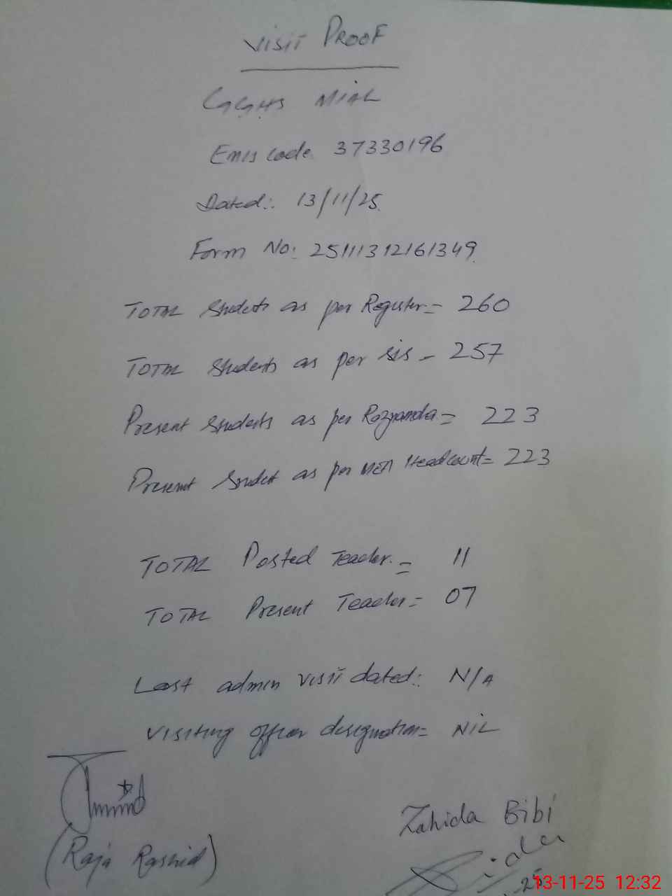 | Remarks (Use Separate Page if Required): Nsb record is not updated on sis and pmiu app 02 rooms are dangerous which is not used for teaching due to roof are broken | |||||