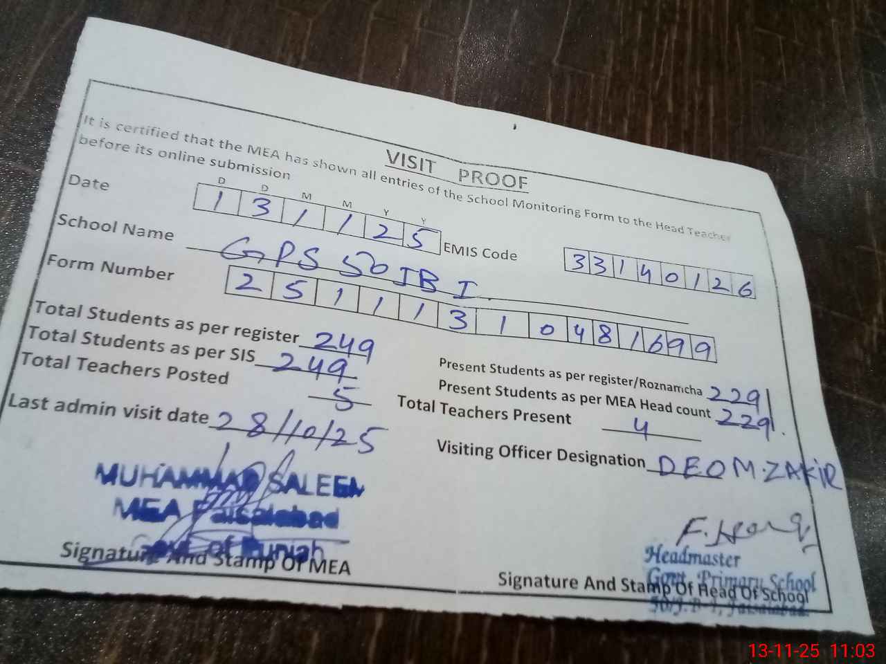 | Attendance Register | Head Teacher | MEA with School | Visit Proof |
