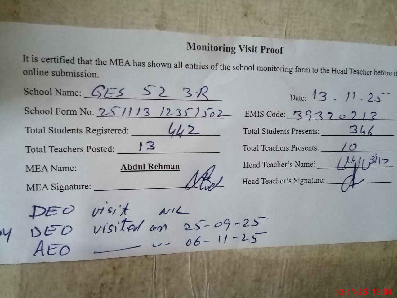 | Remarks (Use Separate Page if Required): There is no visit of DEO Dy DEO visited on 25 September 2025 AEO Visited on 06 November 2025 Boundary walls about 200 Rtf is not available | |||||