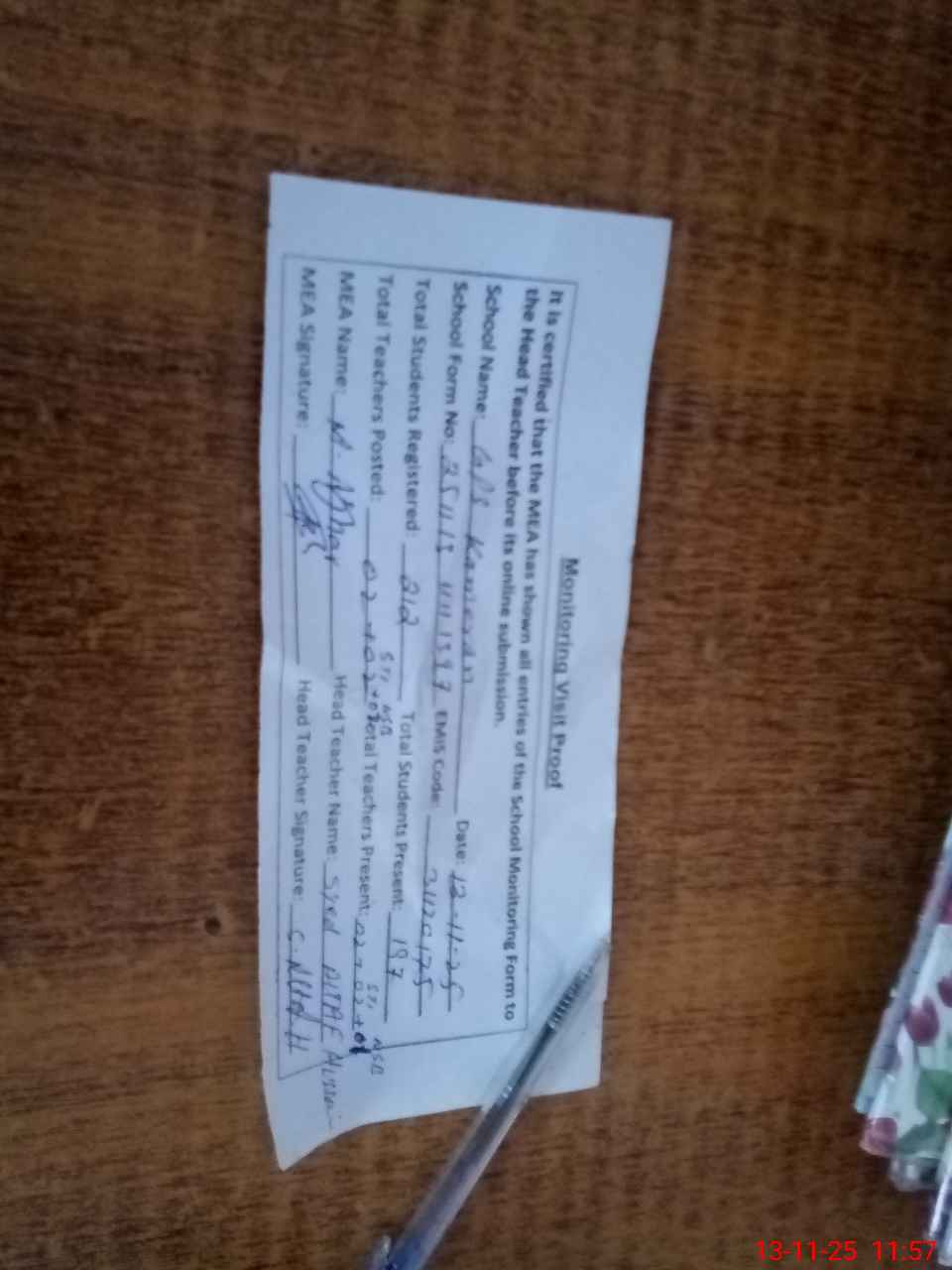 | Attendance Register | Head Teacher | MEA with School | Visit Proof |