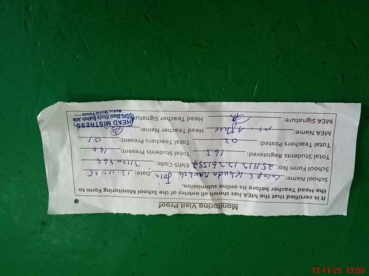 | Attendance Register | Head Teacher | MEA with School | Visit Proof |