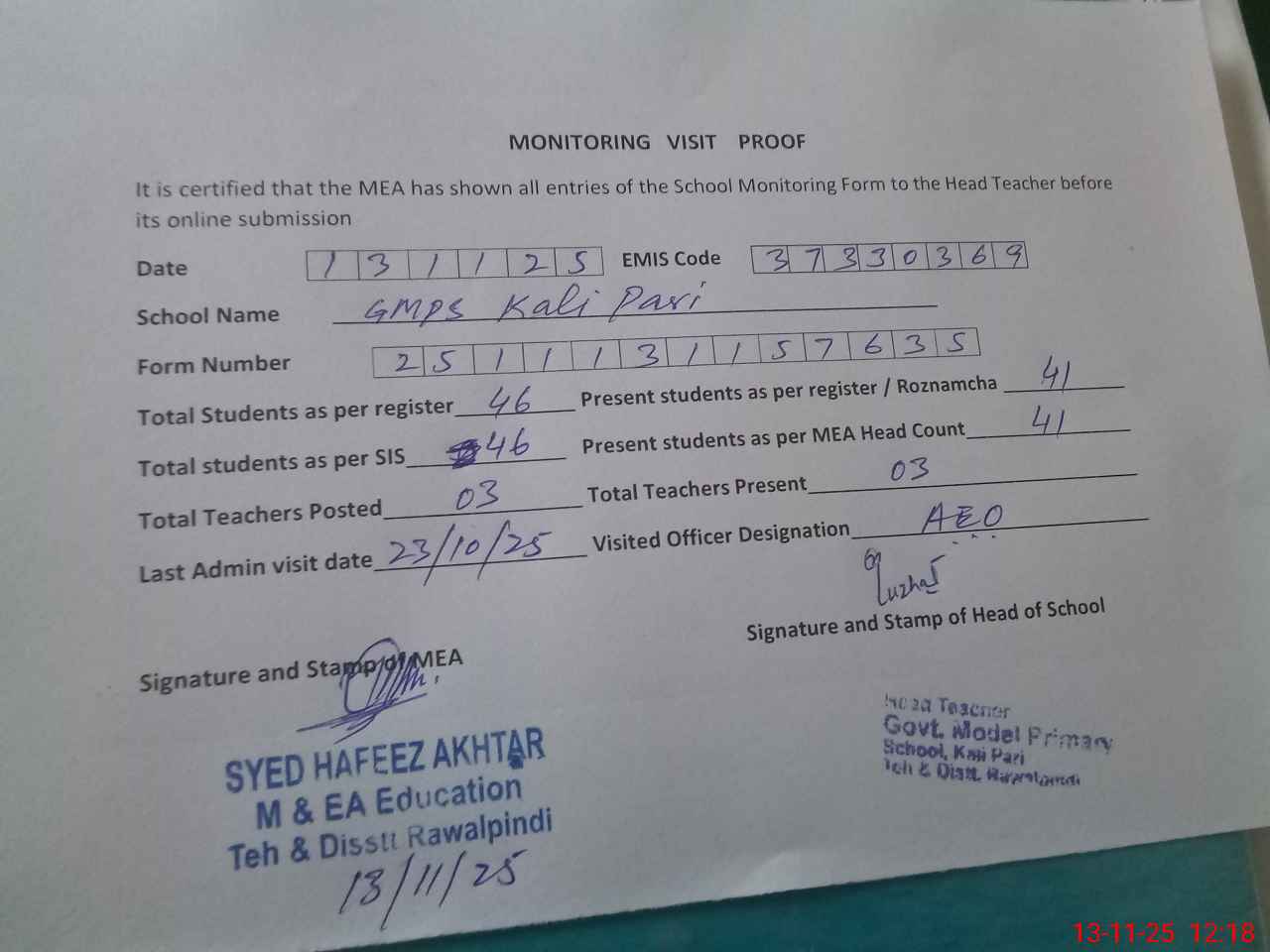 | Attendance Register | Head Teacher | MEA with School | Visit Proof |