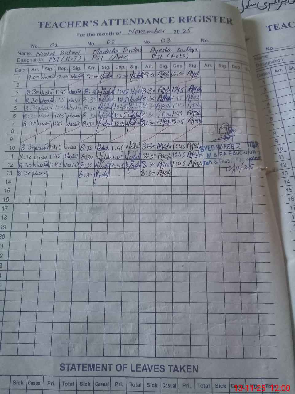 | CNIC | Full Name | Designation | R/C | Absence During Last Calender Month |