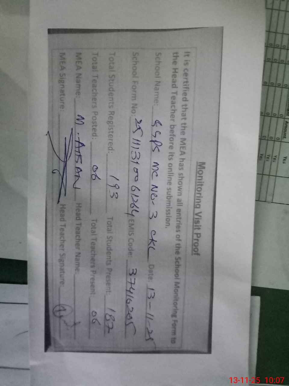 | Attendance Register | Head Teacher | MEA with School | Visit Proof |