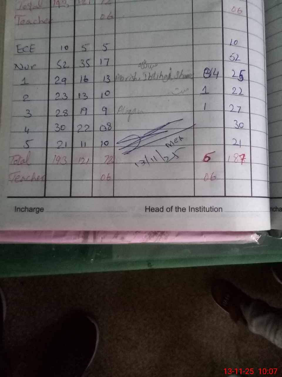 | Total Students Present | 10 | 0 | 52 | 25 | 22 | 27 | 30 | 21 | 187 | |||||||