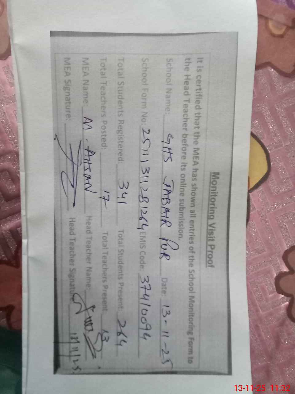| Attendance Register | Head Teacher | MEA with School | Visit Proof |