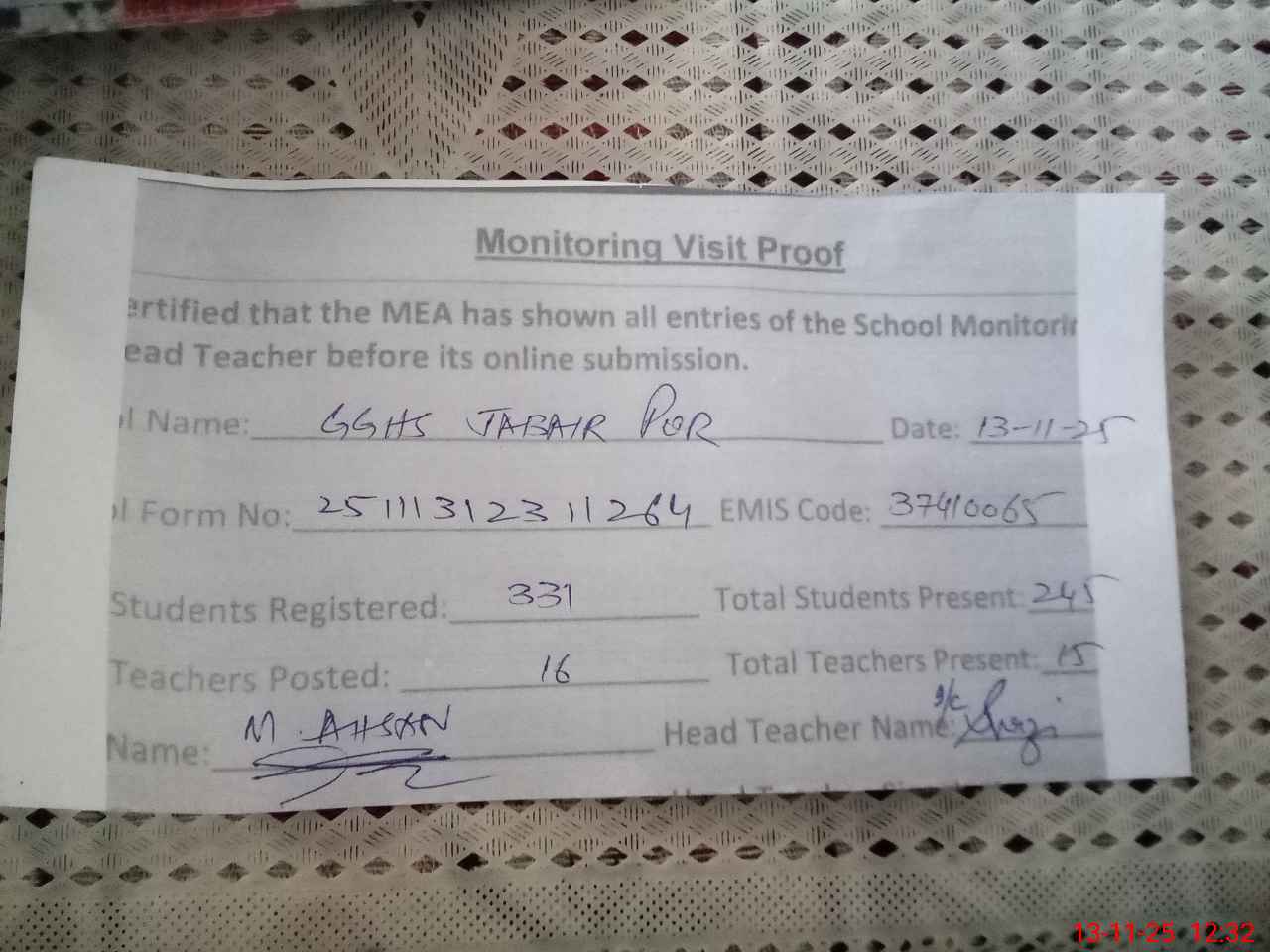 | EMIS Code: 37410065 | Name of School: GGHS JABAIR PUR CHAKWAL | |||