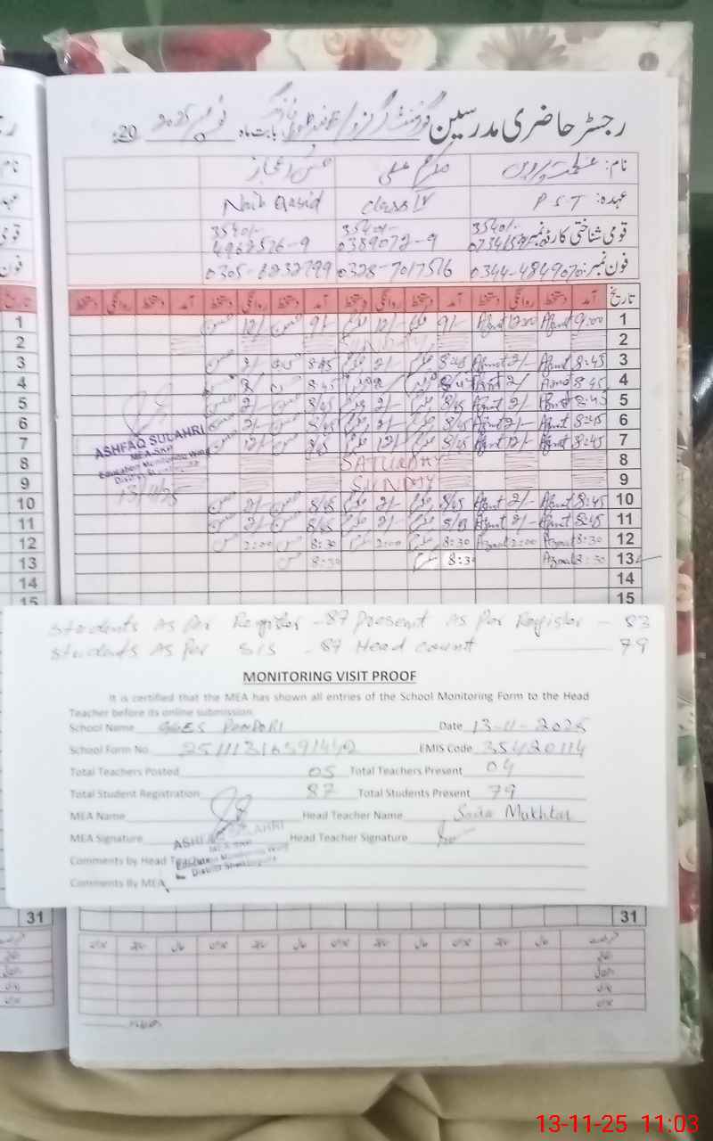 | Attendance Register | Head Teacher | MEA with School | Visit Proof |