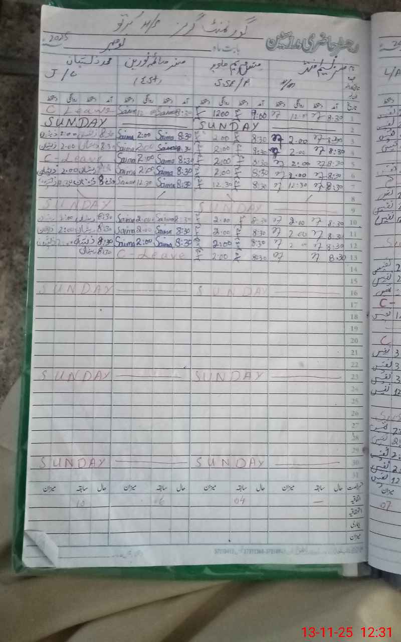 | CNIC | Full Name | Designation | R/C | Absence During Last Calender Month |