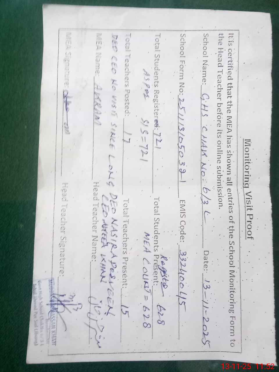 | Attendance Register | Head Teacher | MEA with School | Visit Proof |