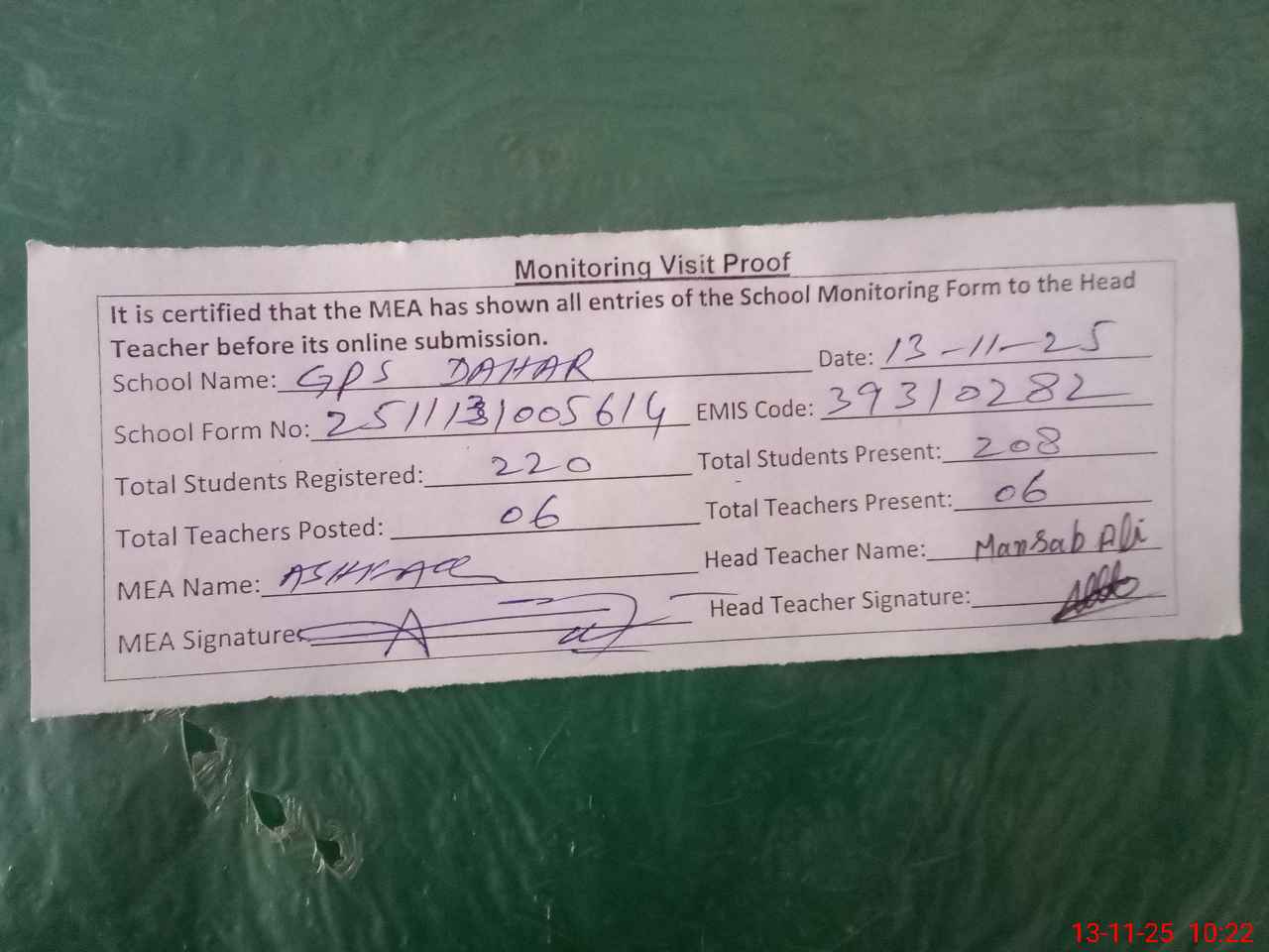 | Attendance Register | Head Teacher | MEA with School | Visit Proof |