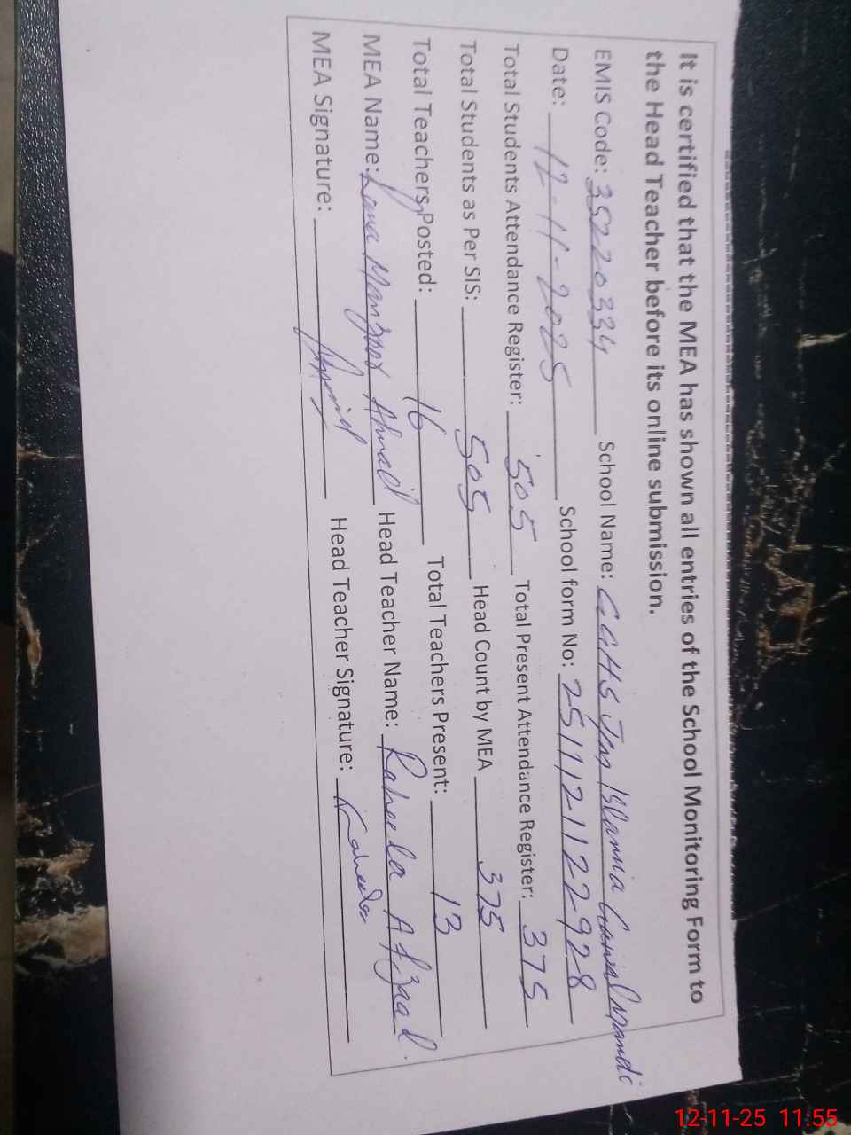 | Attendance Register | Head Teacher | MEA with School | Visit Proof |