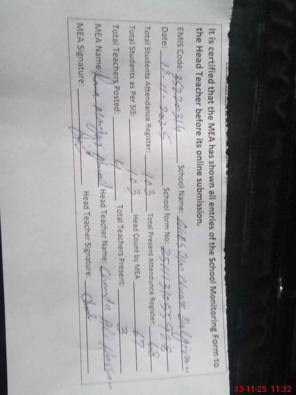 | Attendance Register | Head Teacher | MEA with School | Visit Proof |