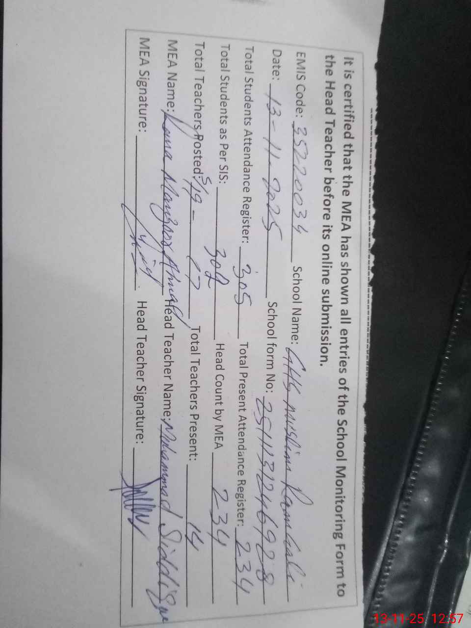| Attendance Register | Head Teacher | MEA with School | Visit Proof |