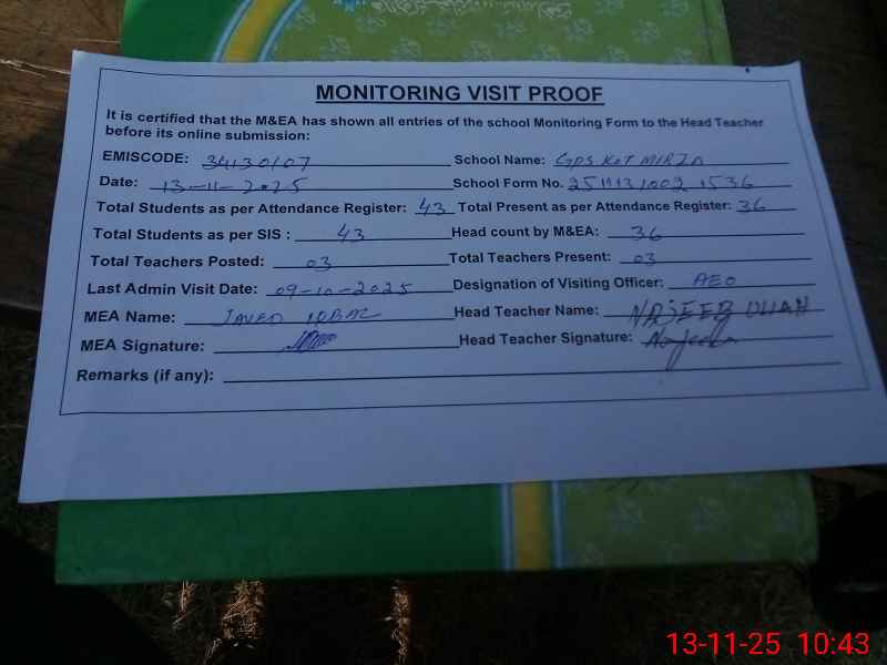 | EMIS Code: 34130107 | Name of School: GPS KOT MIRZA JAN | |||