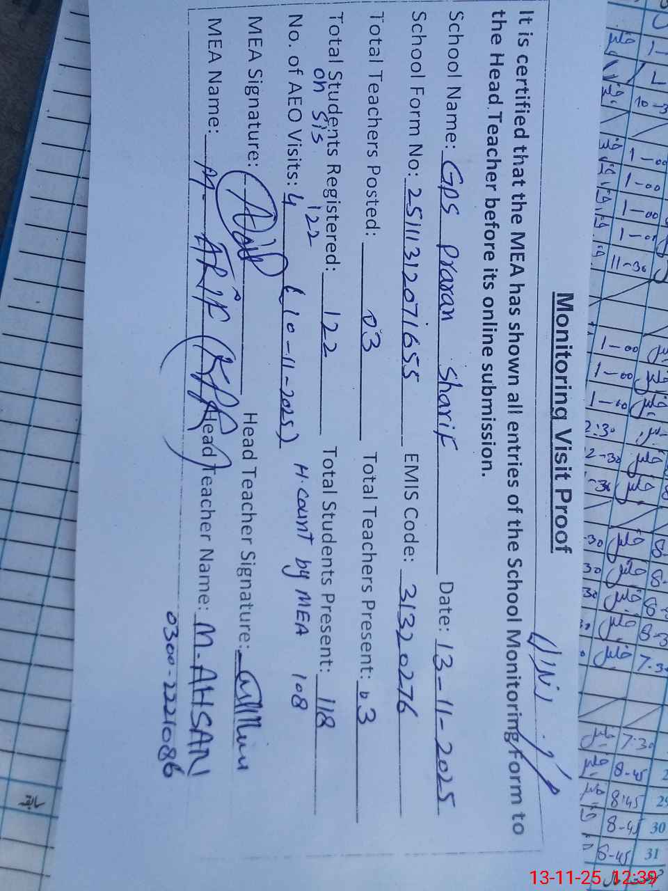 | Attendance Register | Head Teacher | MEA with School | Visit Proof |