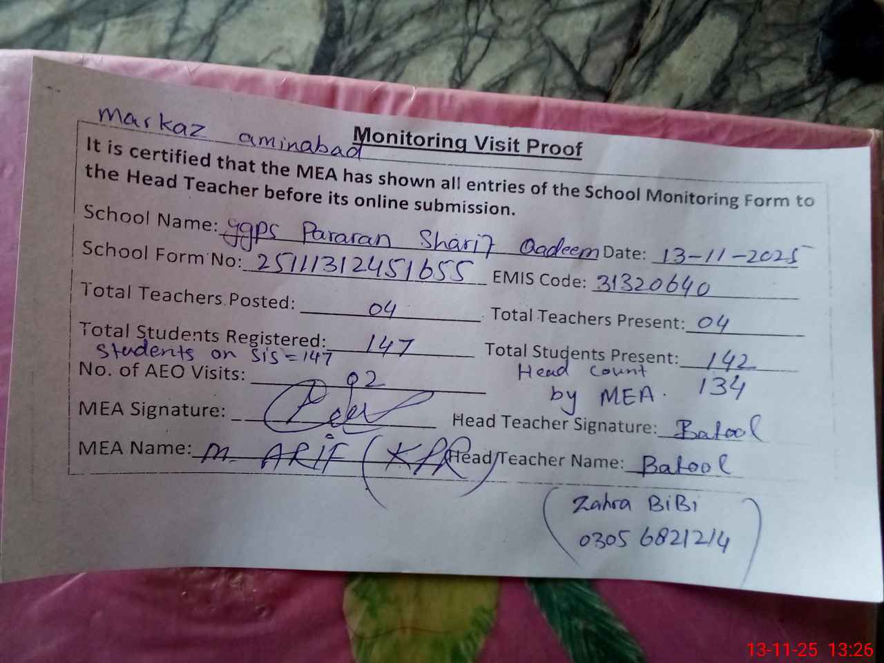 | Attendance Register | Head Teacher | MEA with School | Visit Proof |
