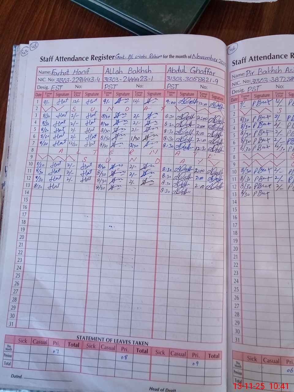 | CNIC | Full Name | Designation | R/C | Absence During Last Calender Month |