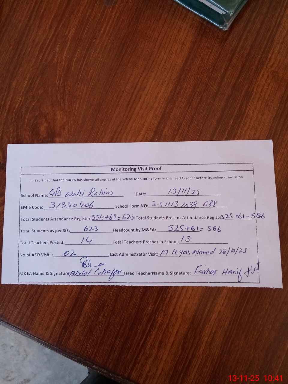 | Attendance Register | Head Teacher | MEA with School | Visit Proof |