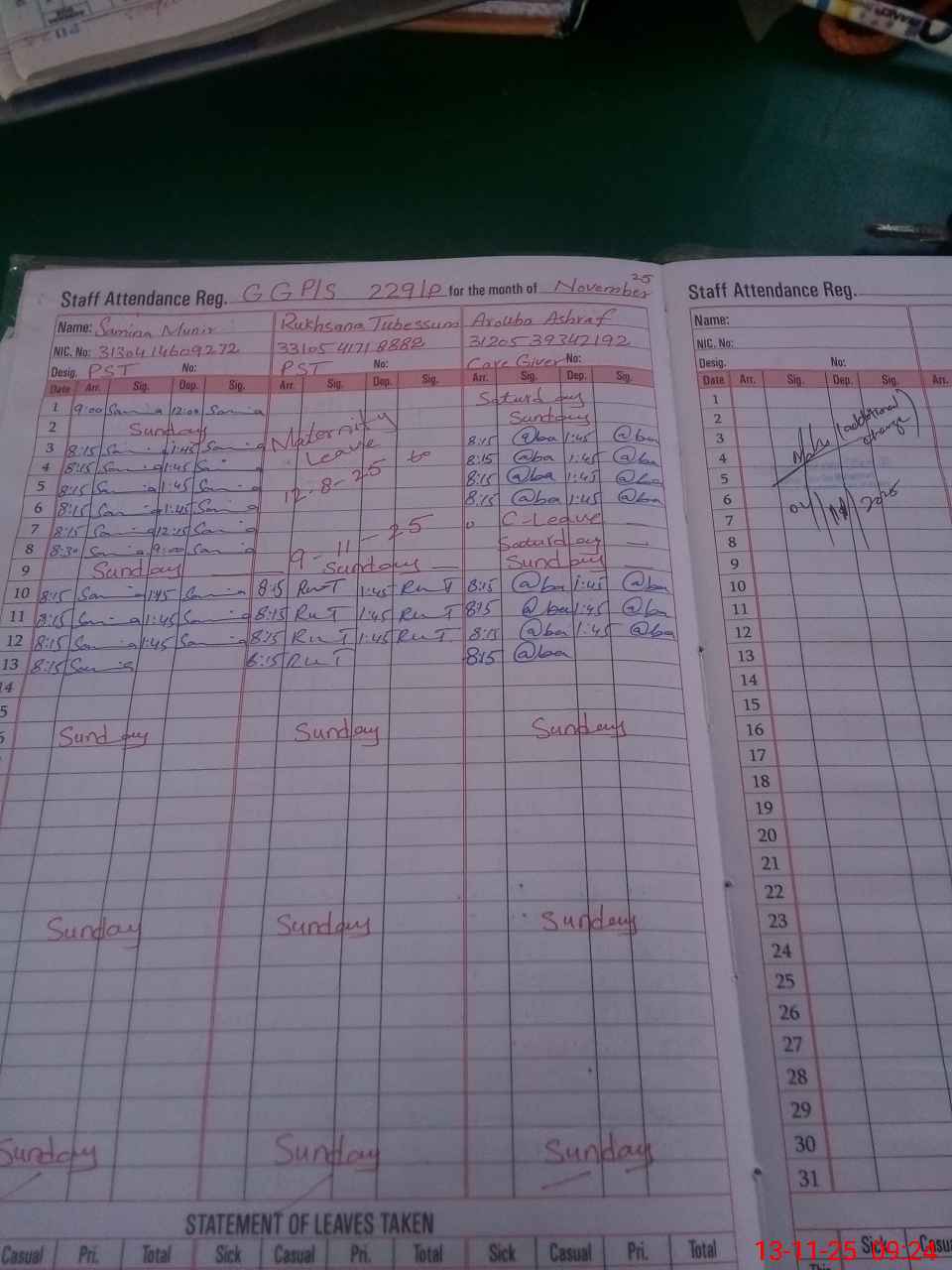 | CNIC | Full Name | Designation | R/C | Absence During Last Calender Month |