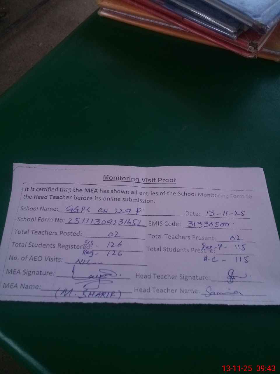 | Attendance Register | Head Teacher | MEA with School | Visit Proof |
