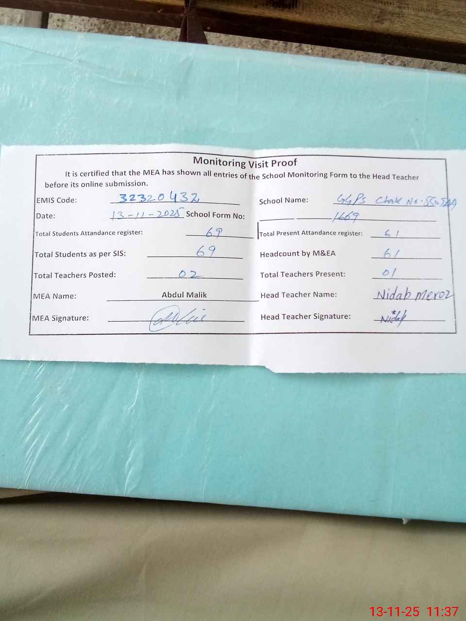| Attendance Register | Head Teacher | MEA with School | Visit Proof |