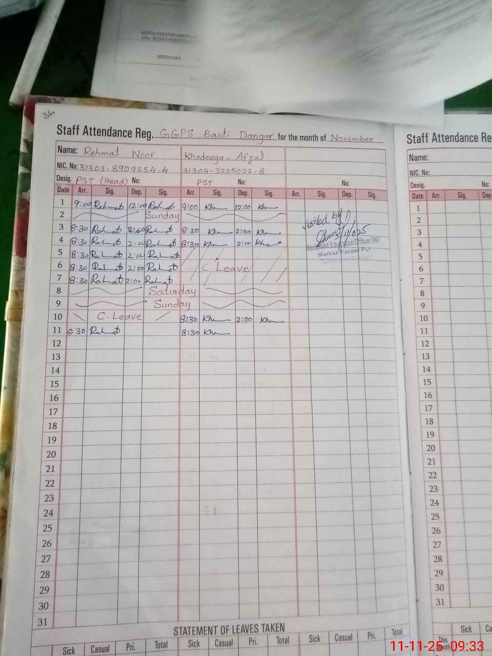 | CNIC | Full Name | Designation | R/C | Absence During Last Calender Month |