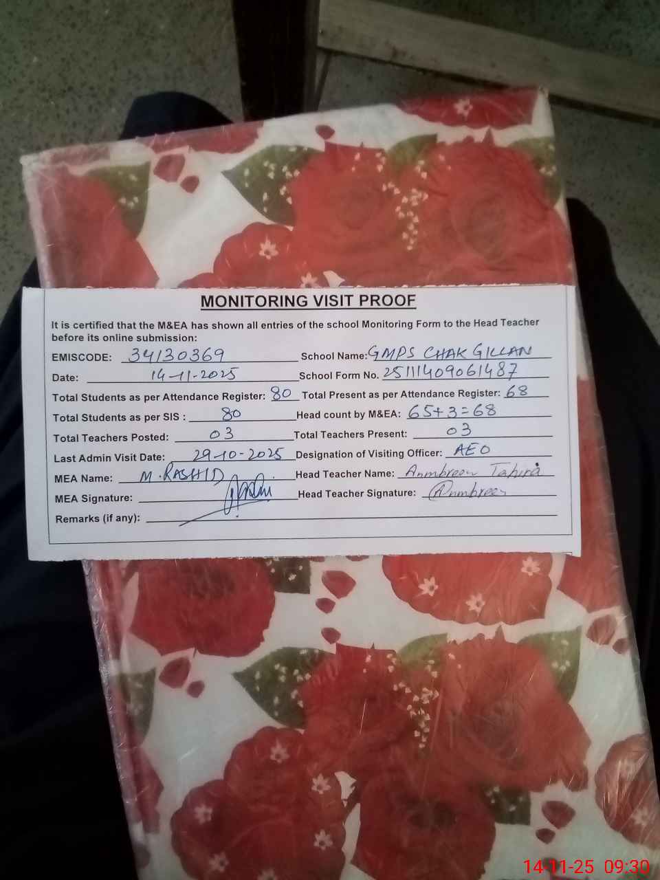 | Attendance Register | Head Teacher | MEA with School | Visit Proof |