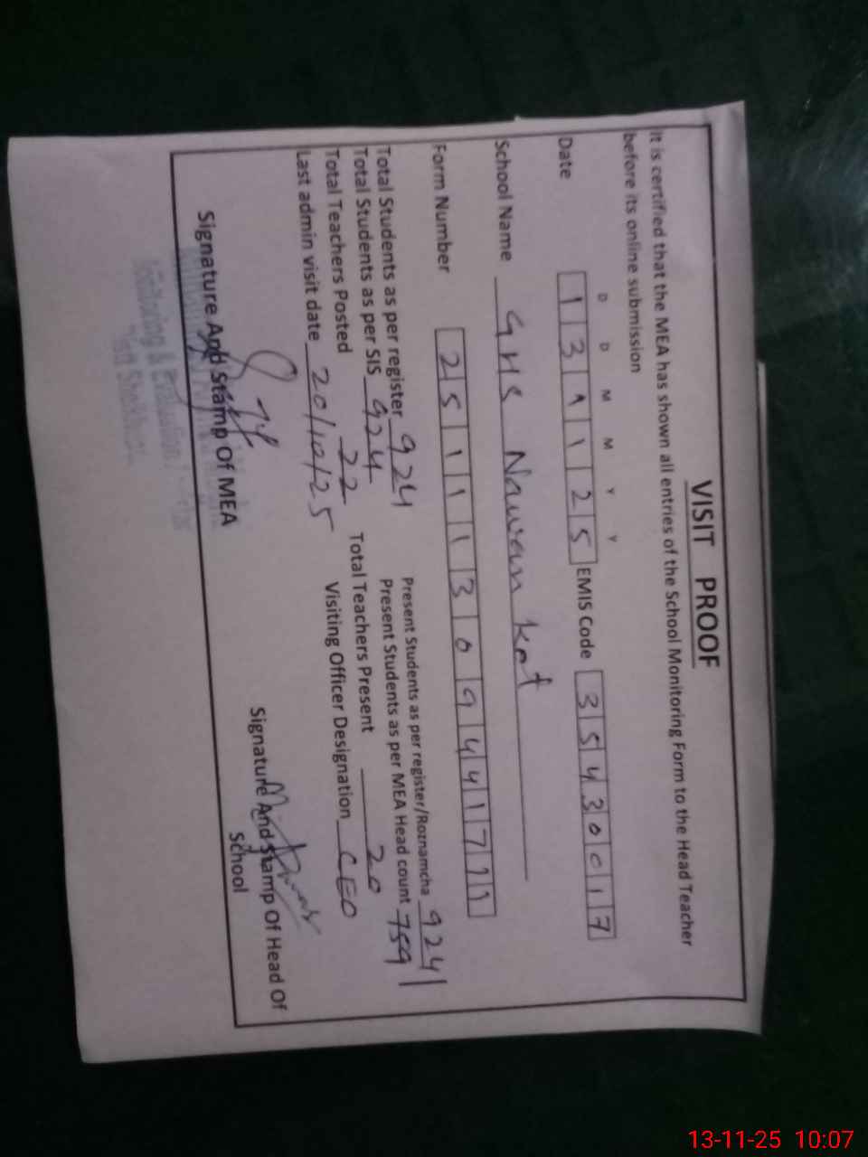 | Attendance Register | Head Teacher | MEA with School | Visit Proof |