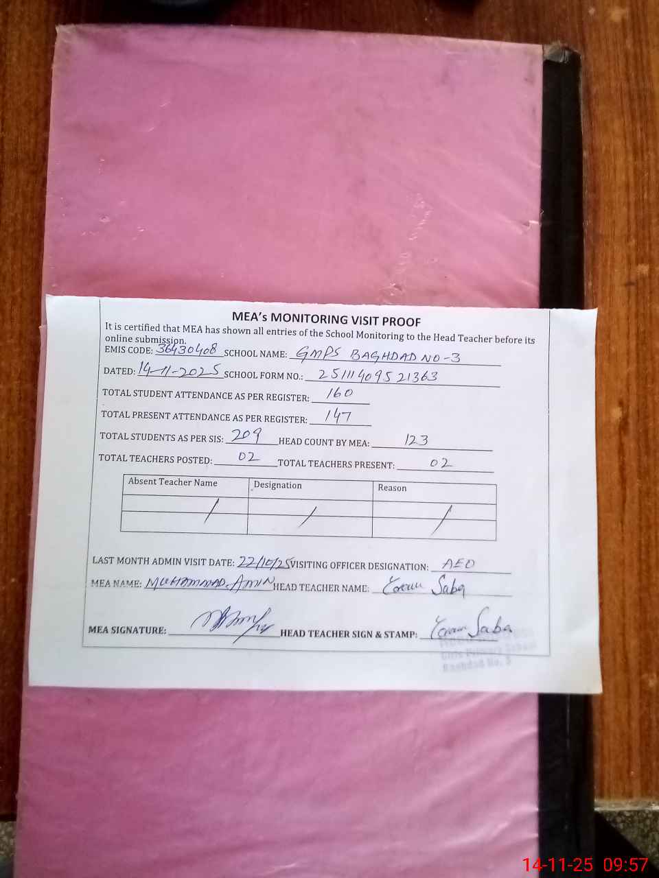| Attendance Register | Head Teacher | MEA with School | Visit Proof |