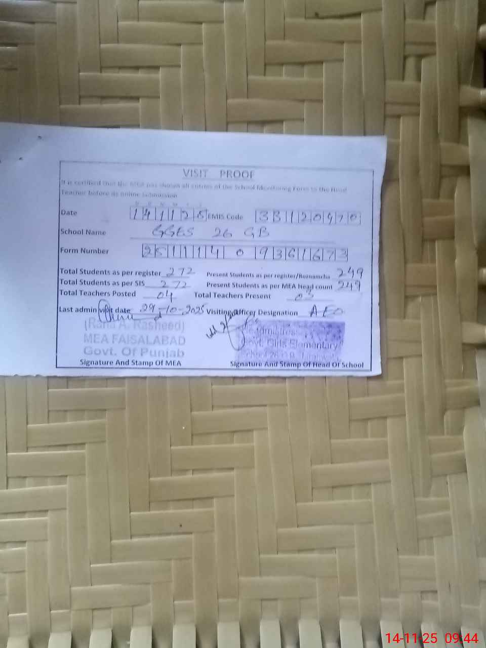 | EMIS Code: 33120470 | Name of School: GGES CHAK 26 GB SATIANA | |||