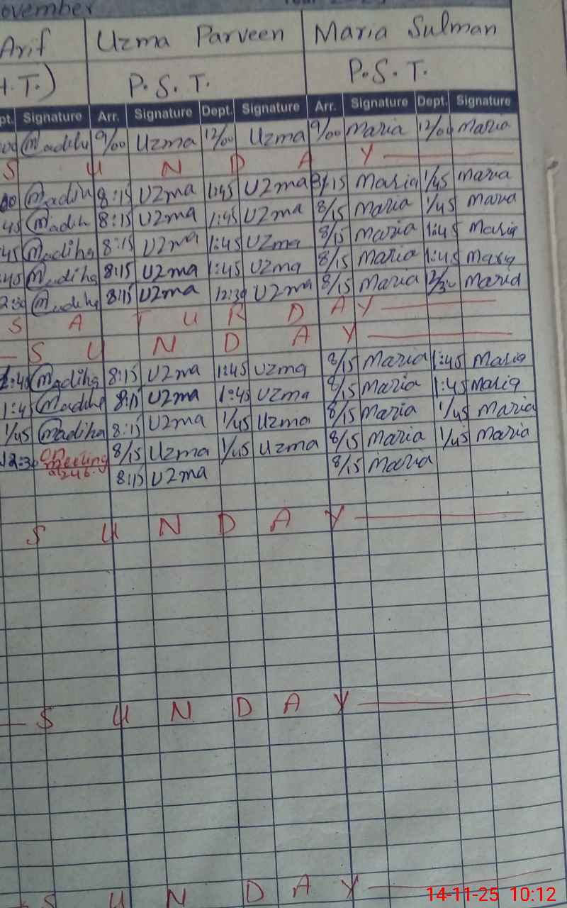 | CNIC | Full Name | Designation | R/C | Absence During Last Calender Month |